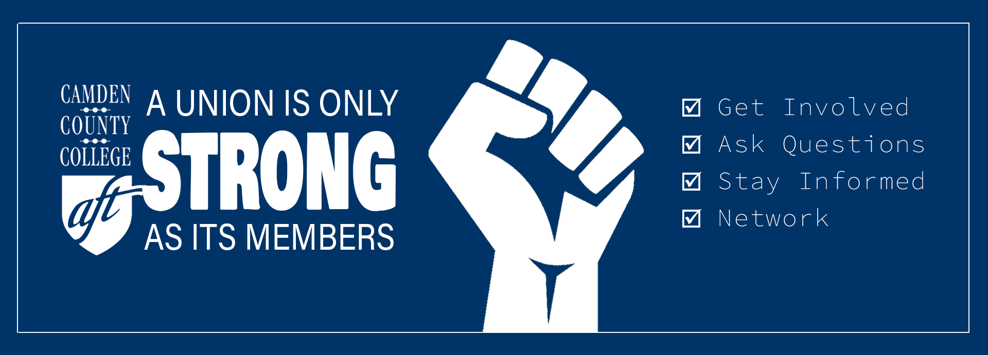 This is the AFT website for the adjunct union chapter at Camden County College campuses in Blackwood, Camden and Cherry Hill, New Jersey. We are the CCC chapter of United Adjunct Faculty of New Jersey AFT #2222. Our original union, Camden County College Adjunct Faculty Federation (CCCAFF), was founded in 1995 to represent the economic, social and professional interests of part-time contingent faculty. It is affiliated with the American Federation of Teachers (AFT) and the international union of the AFL-CIO. In 2009, the NJ AFT community college locals voted to join together to form a super local called United Adjunct Faculty of New Jersey (UAFNJ). The Camden County Chapter of UAFNJ will continue to maintain local autonomy in dealing with the College. At the moment, including the members from Camden County College, the nine member chapters have more than 3000 members in UAFNJ.