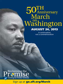 AFT and AFT-Maryland invite members to participate in the 2013 March on Washington, Saturday, August 24th. The nation’s unions will be represented en mass at the August 24th March on Washington.  As in 1963, the nation’s workers will emphasize the need for jobs, justice, and freedom.  Marchers will gather at the Lincoln Memorial on the National Mall and proceed to the new monument that honors Martin Luther King, Jr., the slain civil rights leader who galvanized marchers in 1963 with his “I Have A Dream” speech.